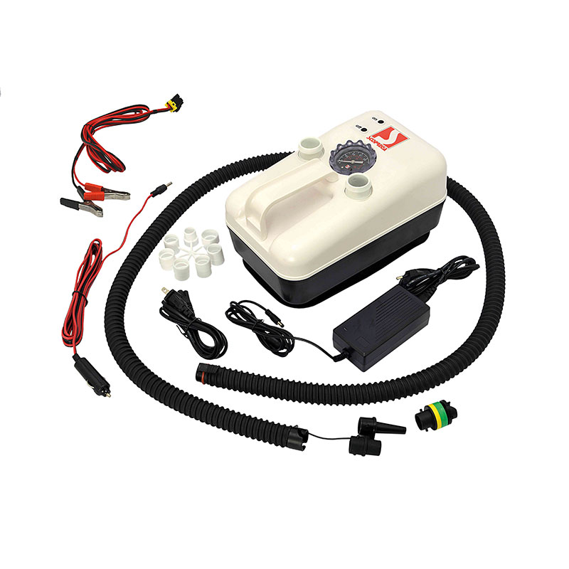 Elektrische Luftpumpe mit integrierter 12V DC Batterie, welche mit einem Zigarettenanzünder oder Standard 110-240 AC / DC-Adapter aufgeladen wird. Zum Aufpumpen und Entleeren. Das Gerät stoppt bei Erreichen des ingestellten Drucks automatisch. Ebenfalls kann die Pumpe mit einer externen Batterie (Krokodilklemmen) betrieben werden.